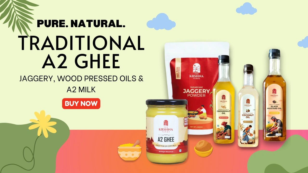 The Krshna Farms has been serving pure Gir cow A2 milk & A2 Ghee for last 7 years. The milk & Desi cow Ghee has been supplied from our dairy farm to your house directly. Newly added products- Jaggery Powder, Woodpressed Groundnut Oil, Coconut oil, Black Mustard Oil.
